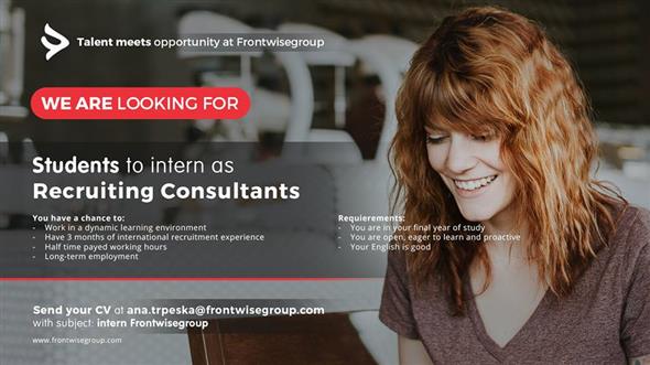 Frontwisegroup has an open position for students to intern as Recruiting Consultants. If you are in your final years of study and want to work with international clients, please send your CV at [email protected] no later than 16 July 2017