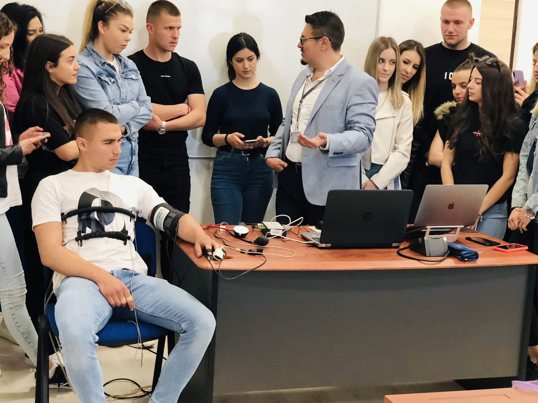 Студентите од Факултетот за детективи и безбедност во рамките на практичната настава, денеска имаа предавање за улогата и употребата на полиграфот во решавање на криминални дела. М-р Костадин Иванов, полиграфист од Министерството за внатрешни работи го сподели неговото драгоцено искуство од работењето со полиграфот и на студентите практично им го покажа значењето на овој инструмент, неговите составни делови, условите за користење, како и правилата за полиграфско тестирање.