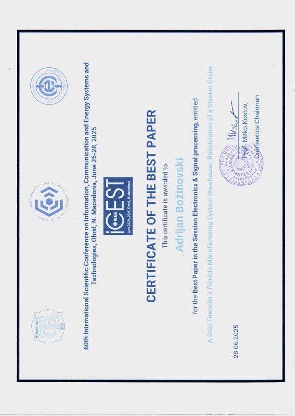 На конференцијата ICEST 2025, трудот на проф. Адријан Божиновски од Факултетот по информатика, со наслов "A Step Towards a Flexible Manufacturing System Warehouse: Robotization of a Stacker Crane", доби награда за најдобар труд во сесијата Electronics & Signal Processing.